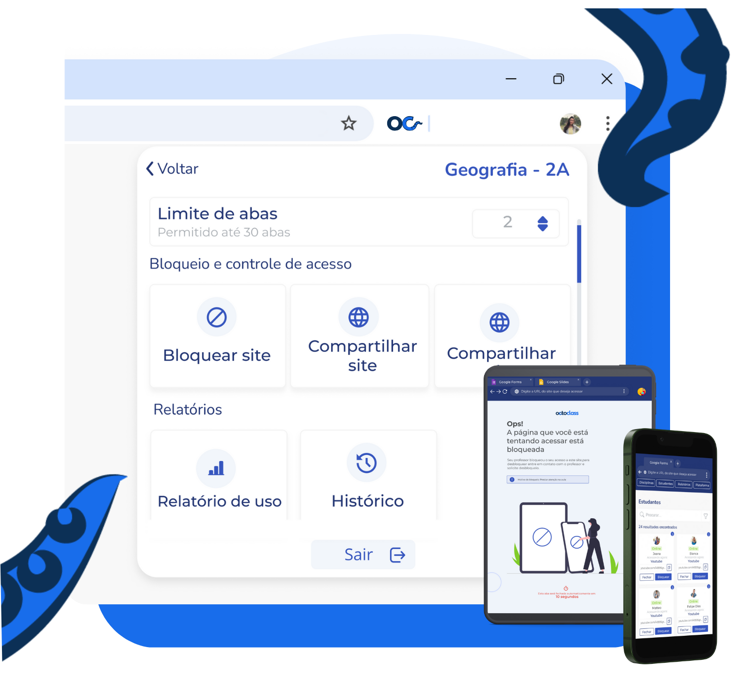 O OctoClass é uma solução de governança digital e segurança escolar que une a gestão de dispositivos à proteção do bem-estar do aluno.